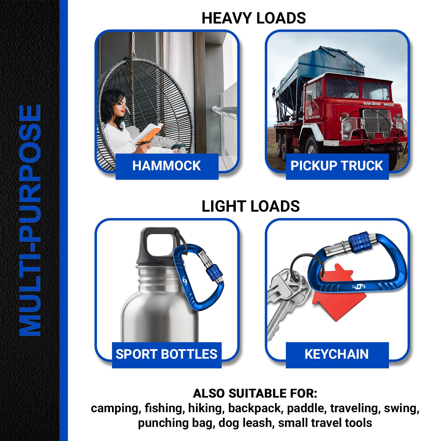 - 【Multi Purpose】 Rhino locking Carabineers are suitable for: hammock, camping, fishing, hiking, backpack, paddle, traveling, swing, punching bag, dog leash, attach sports bottles, yeti sling, keychain, travel tools, fix heavy object on a pickup truck, backpack clips for kids, key knife keychain for women, bag hook, snap hooks, key clip for men, accessory & keychain carabiners, gear ties, toy grappling hook, cable machine accessories, key holder, d ring, boxing bag. Not For Climbing.
